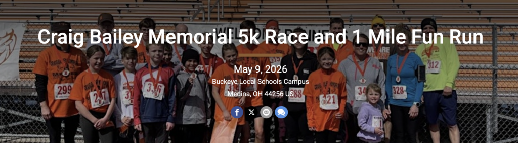 You are invited to join Buckeye students, families, businesses, and community members for a family-focused event that includes a 5k race and 1-mile fun run or walk on Saturday, May 9th, 2026 at the Buckeye Track and Soccer Complex located behind the elementary buildings at Buckeye Local Schools, 3044 Columbia Road in Medina.